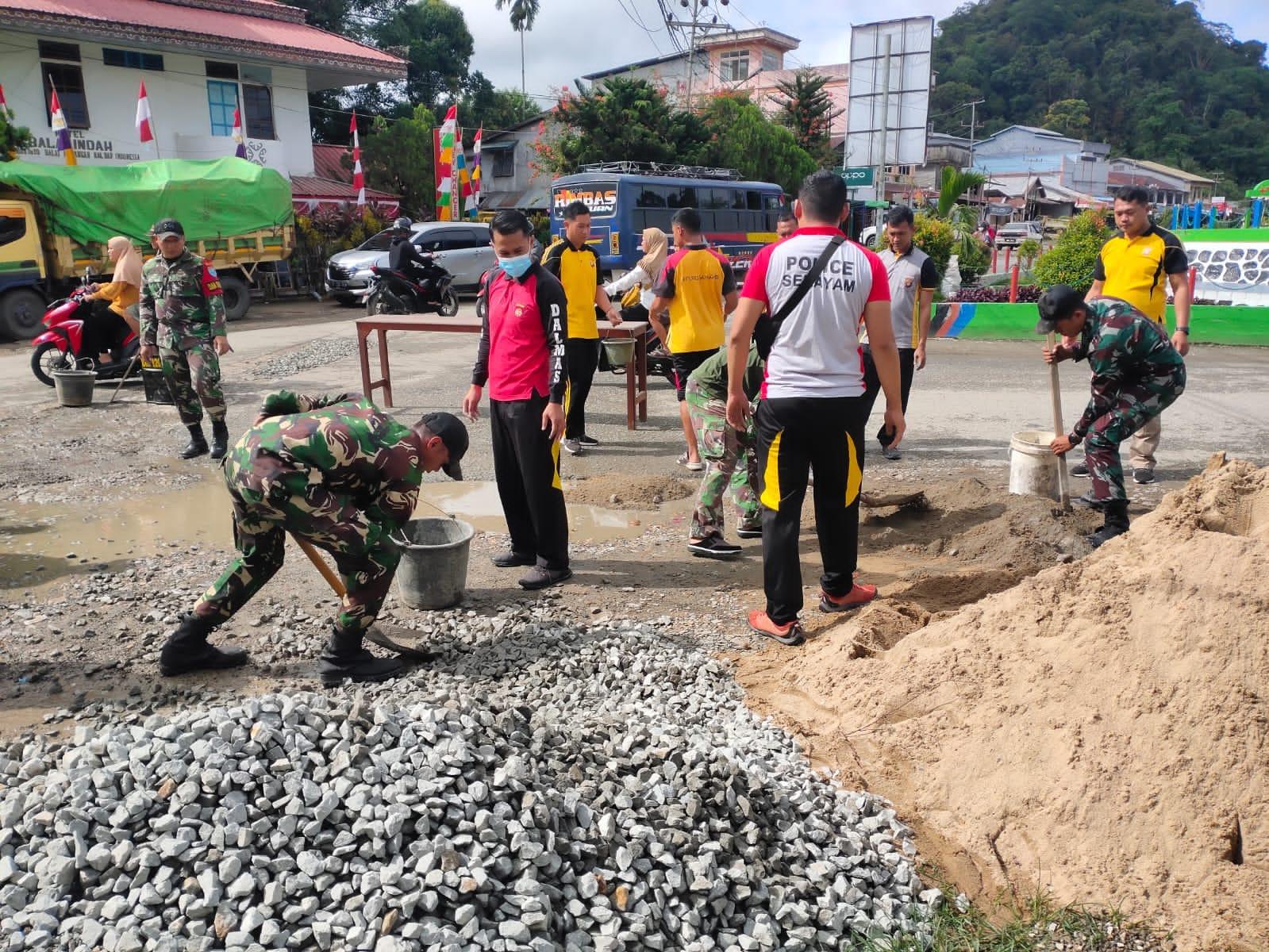 SANGGAU − Personel Satgas Pamtas RI-Malaysia Yonif 645/GTY dipimpin langsung Dan SSK IV Lettu Inf Haris Ferbian Saputra Beserta Anggota Pos Koki Balaikarangan Bersama Danramil beserta Personel Koramil Balaikarangan Dan Kapolsek beserta personel Polsek Sekayam Melaksanakan Karya Bakti Pengecoran Jalan Raya Sekitaran Tugu Di Balaikarangan, Kec. Sakayam, Kab. Sanggau. Sabtu, (27/08/2022).