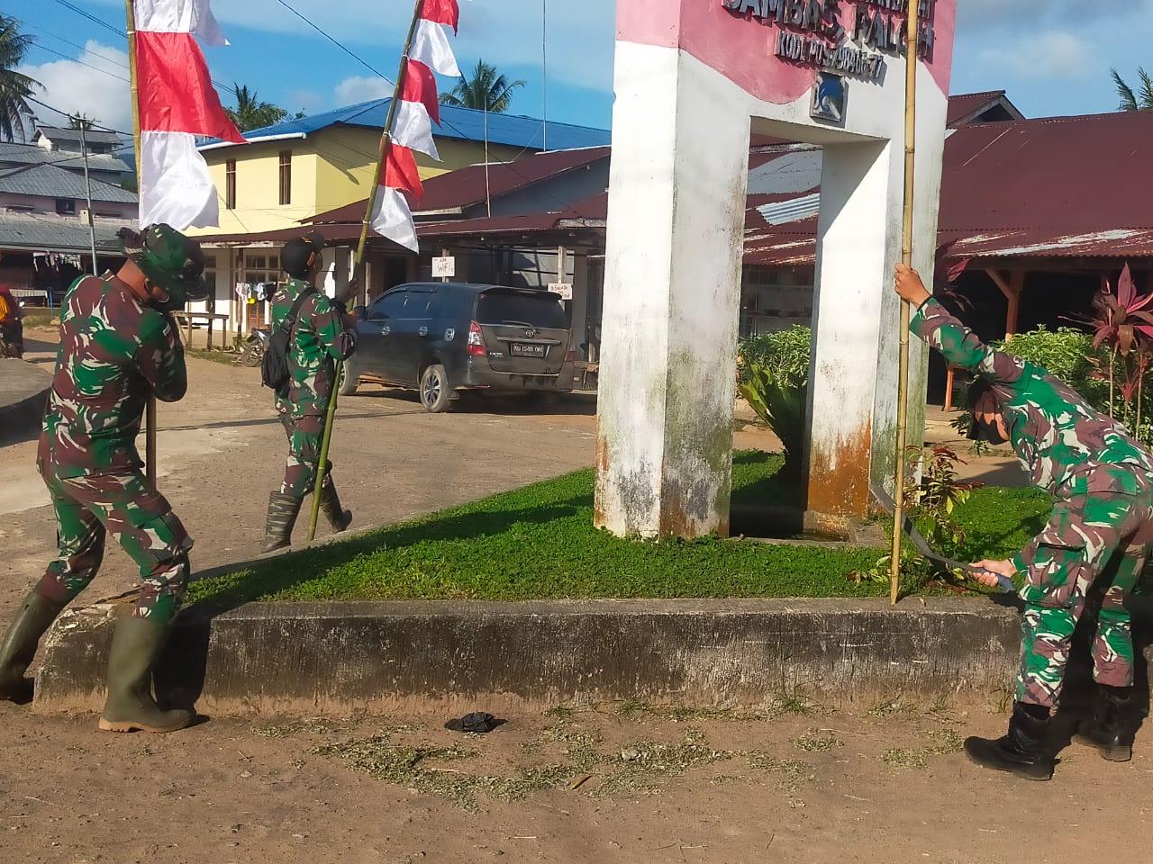 5 orang anggota Pos Camar Bulan dipimpin Danpos Sertu Dedi Januardi melaksanakan karya bhakti berupa gotong royong bersama anggota Koramil Temajuk, Pos Polsubsektor Temajuk dan masyarakat Dusun Camar Bulan membersihkan dermaga pantai Camar Bulan, Minggu (27/03-2022).