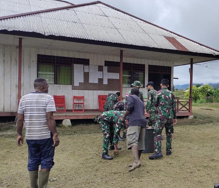 Satgas Yonif Raider 200/BN Ajak Masyarakat Apalapsili Bersihkan Kantor Distrik