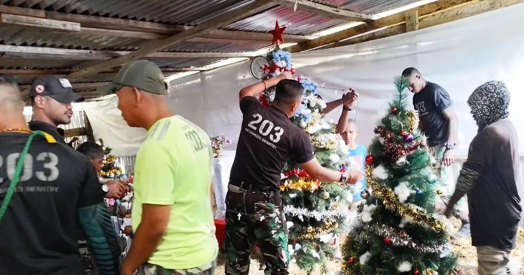 LANNY JAYA – Menyambut Perayaan Natal di Pegunungan Tengah, personel Satgas Yonif Mekanis 203/AK mendekor gereja bersama dengan jemaat Gereja Baptis Wiyaware bertempat di Distrik Pirime, Kabupaten Lanny Jaya, Jumat (9/12/2022).