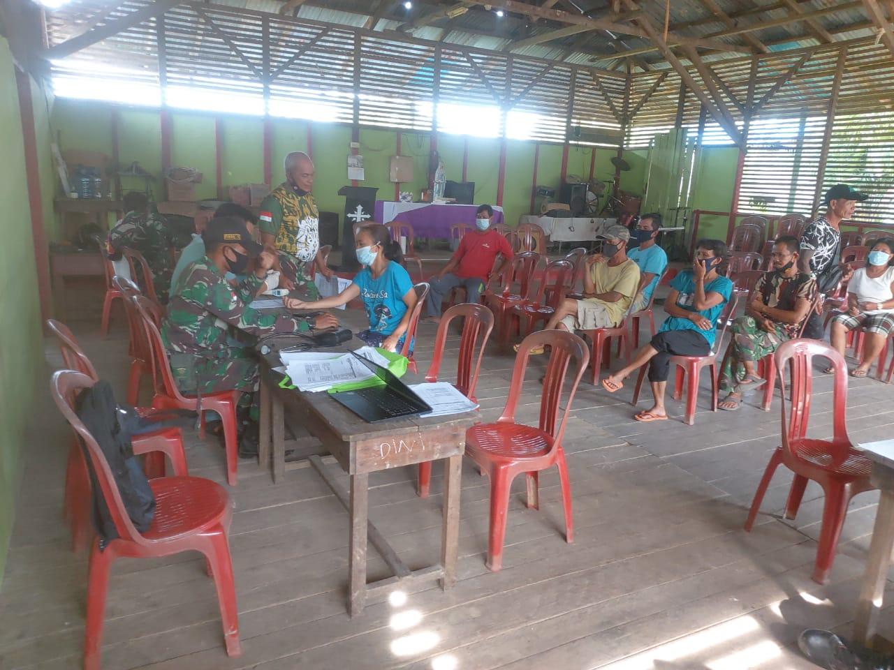 Sinergitas Anggota Satgas Yonif 144/JY Serbuan Vaksinasi dDosis ke-3 Bersama Polri dan Nakes Puskesmas di Perbatasan