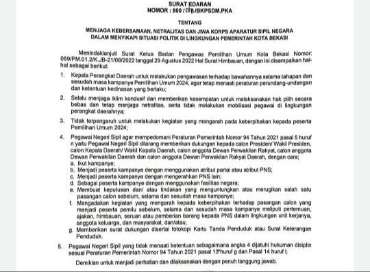 KOTA BEKASI – Dalam menindaklanjuti surat Ketua Badan Pengawas Pemilihan Umum Kota Bekasi bernomor : 069/PM.01.2/K.JB-21/08/2022 tanggal 22 Agustus 2022, dalam hal ini Pemerintah Kota Bekasi mengeluarkan surat edaran yang ditandatangani oleh Sekretaris Daerah Kota Bekasi bernomor 800/5878/BKPSDM.PKA bahwa dijelaskan sebagai berikut :