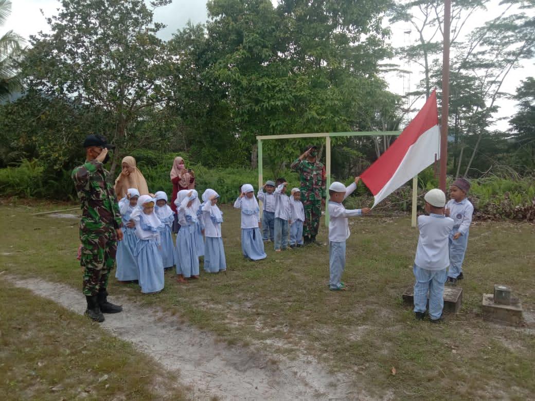 SAMBAS, KALBAR  – Pembentukan disiplin dan karakter pada usia dini sangat diperlukan, untuk itu Satgas Pamtas Yonif Mekanis 643/Wns melatih tata cara Upacara Bendera kepada anak-anak TK Al-Hidayah Dusun Sempadan, Desa Temajuk, Kec. Paloh, Kab Sambas.