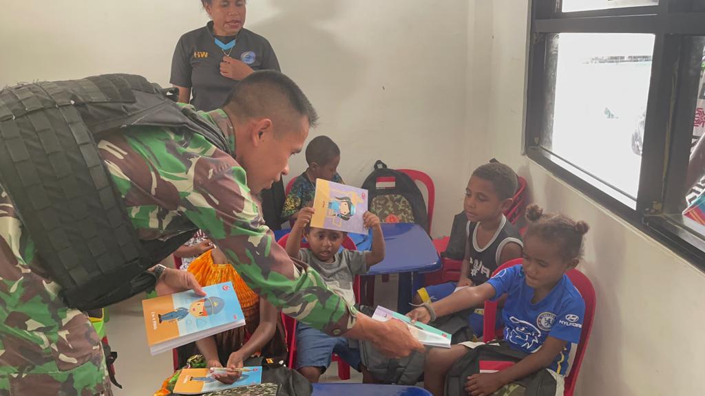 JAYAPURA  – Dalam rangprogram pemerintah untuk mencerdaskan generasi penerus bangsa, anggota Pos Kotis Satgas Pamtas RI-PNG Yonif 711/Rks Brigif 22/OM berinisiatif mengajak anak-anak TK Irene bermain sambil belajar bersama dan membagikan tas dan alat tulis gratis di Kampung Skouw Sae, Distrik Muara Tami, Kota Jayapura, Papua, Sabtu (24/9/2022).