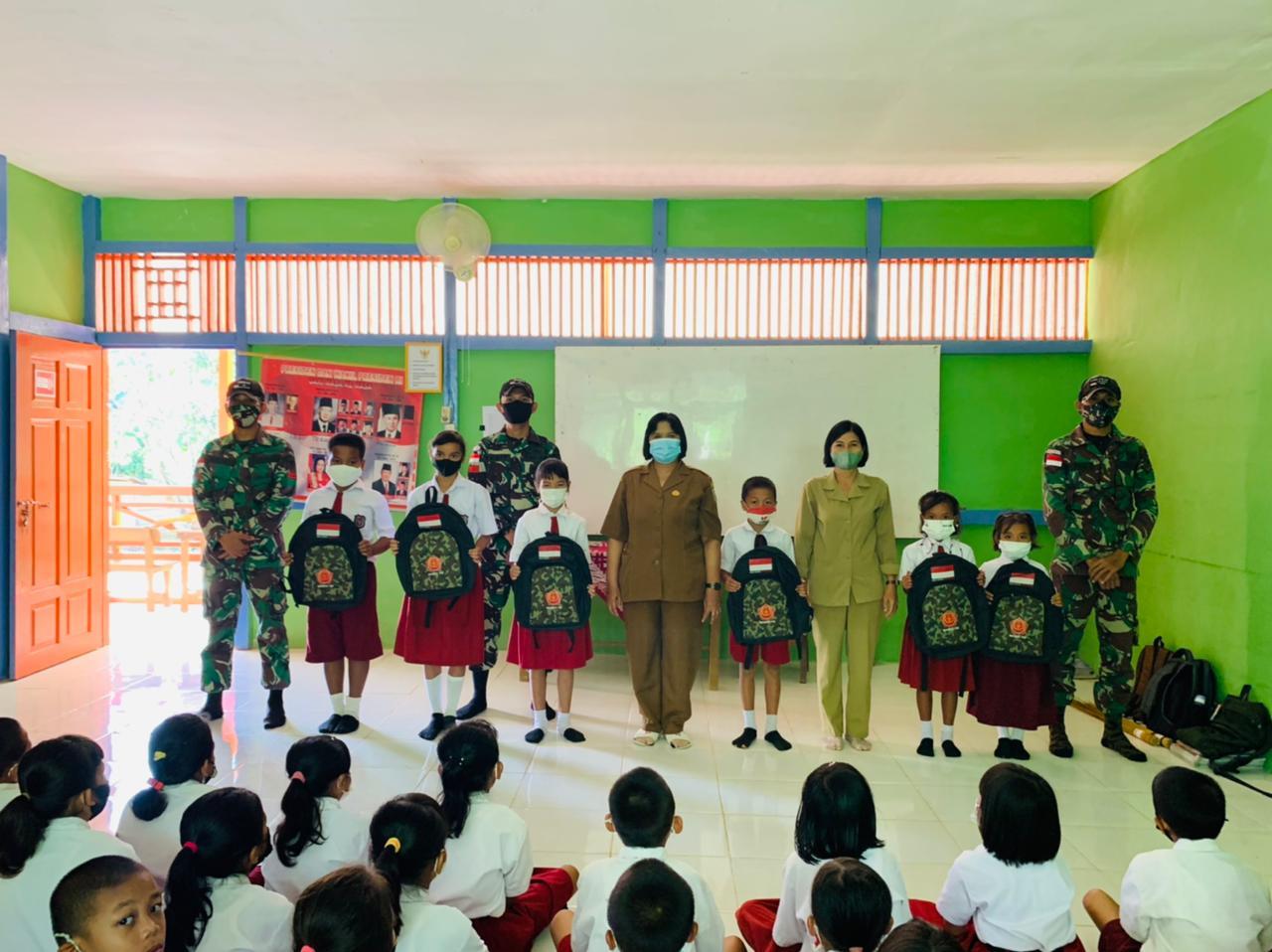 Tingkatkan Semangat Belajar, Satgas Pamtas Yonif Mekanis 643/Wns Berikan Tas Sekolah Kepada Anak SD Perbatasan