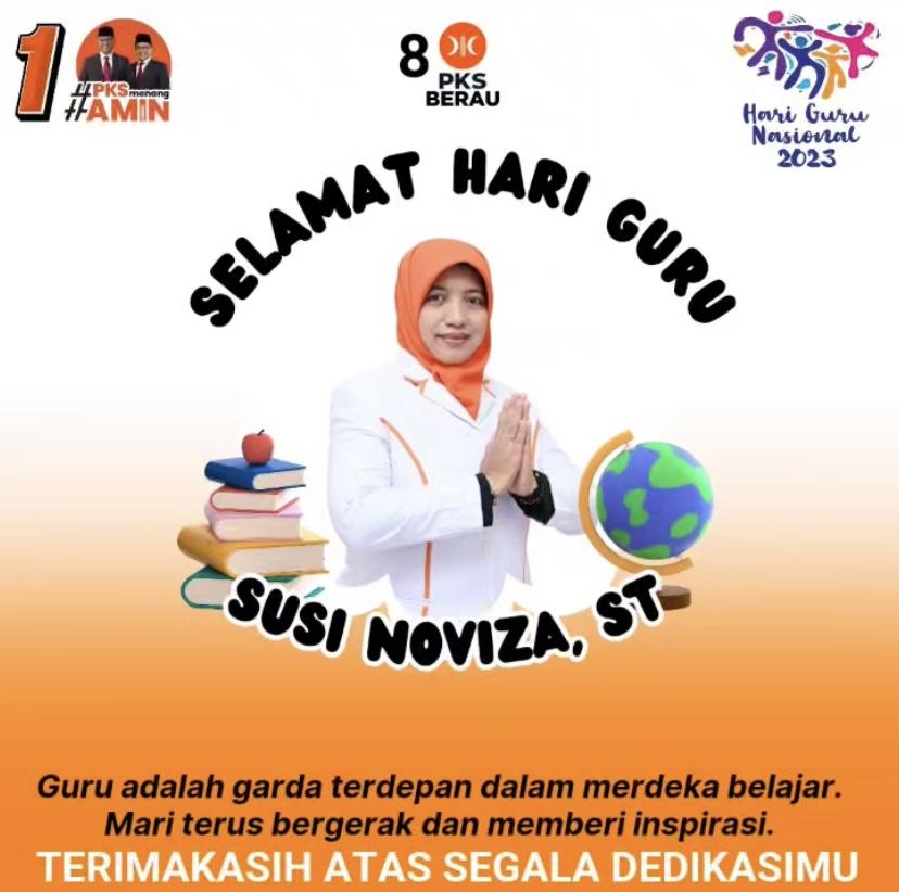 TANJUNG REDEB, Berau Global Satu – Caleg DPRD Kabupaten Berau, Susi Noviza, ST mengucapkan selamat Hari Guru Nasional (HGN) ke 77 kepada seluruh guru se Indonesia, khususnya di Bumi Batiwakkal.