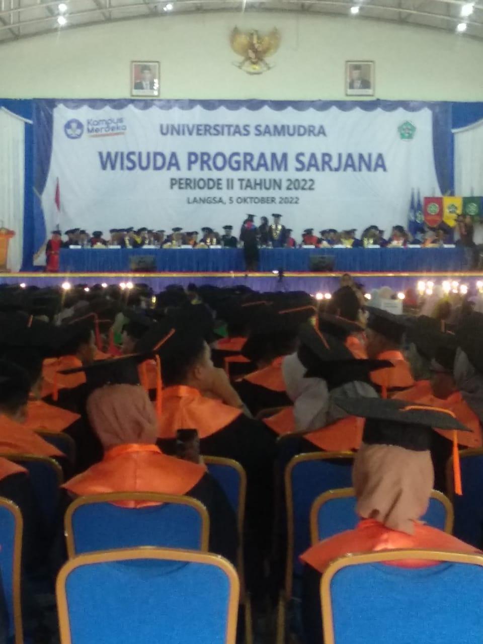 Sidang Senat Terbuka dalam rangka Wisuda Sarjana Periode II Tahun 2022 tersebut dibuka secara resmi oleh Ketua Senat Universitas Samudra, Dr. Bachtiar Akob, M.Pd dan dinyatakan terbuka untuk umum dihadiri oleh Ketua dan Seluruh Anggota Senat Universitas Samudra, Para Wakil Rektor, Kepala Biro, Para Dekan dan jajarannya, Kepala UPT, Ketua Lembaga, Para Dosen, dan Ormawa.