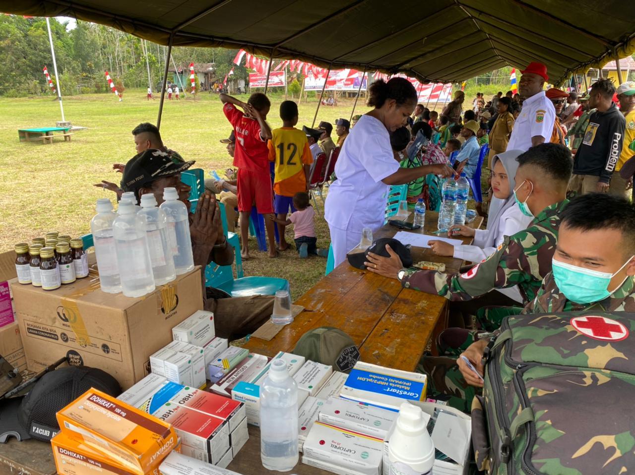 KEEROM –  Masih dalam suasana HUT RI ke-77 Tahun untuk menjaga kesehatan masyarakat di kawasan perbatasan Papua, Pos Yuruf Satgas Yonif 126/KC menggelar pengobatan massal di Kampung Yuruf, Distrik Yaffi, Kabupaten Keerom.