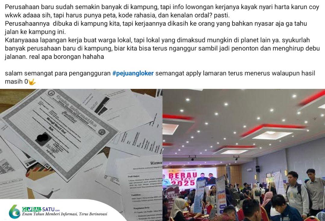 βInfo lowongannya seperti cari harta karun, susah sekali. Padahal perusahaan ada di kampung kita, tapi yang diterima justru orang luar,β tulisnya dalam unggahan yang dibanjiri komentar dukungan dari sesama pencari kerja.