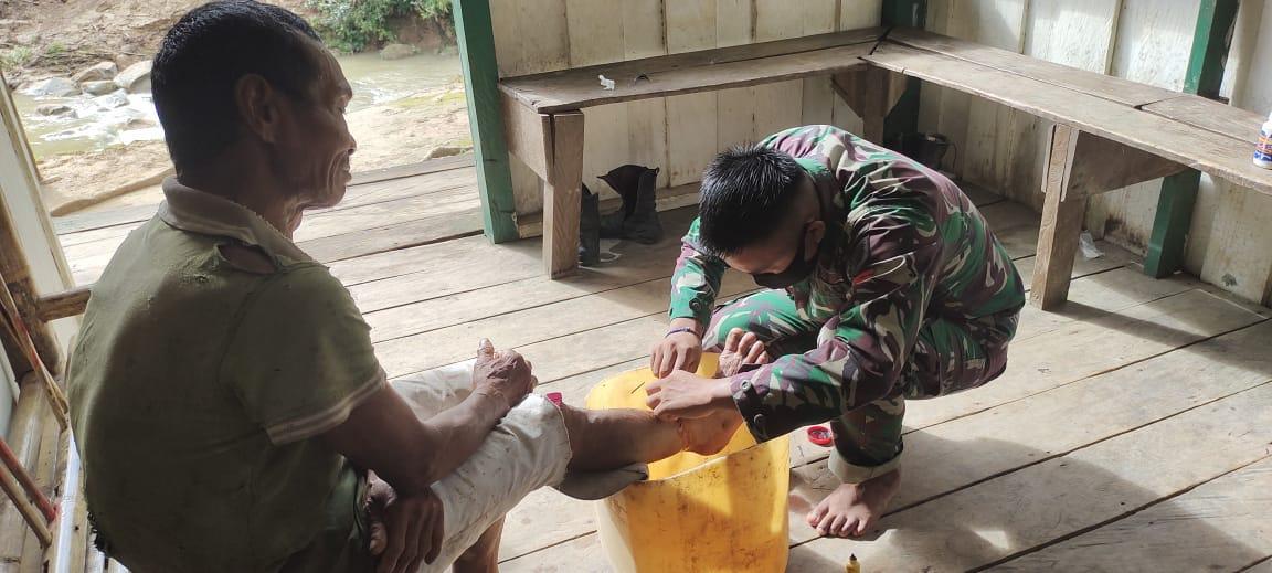 SANGGAU, KALBAR – Terluka akibat terkena parang saat berladang, Satgas Pamtas RI-Malaysia Yonif Mekanis 643/Wns bantu obati bapak Bane (68 th) warga Dusun Guntembawang, Desa Suruh Tembawang, Kec. Entikong, Kab. Sanggau.
