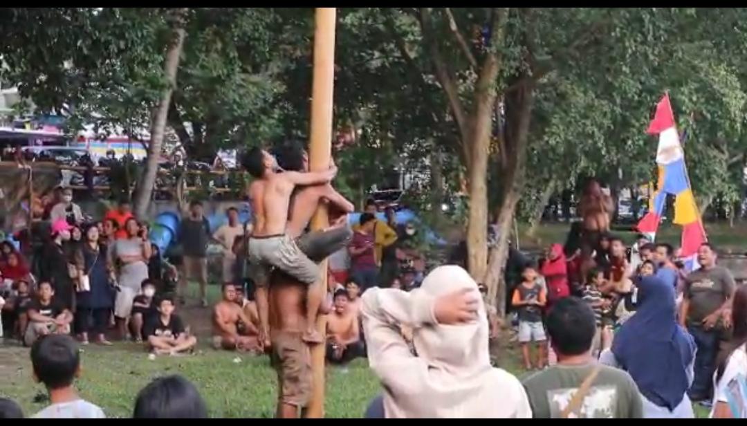 Suara sorakan penonton baik dari warga maupun pegendara yang melintas menyemangati tujuh tim peserta lomba panjat pinang, dimana satu tim terdiri dari empat orang yang secara bergantian beraadu ketangkasan meraih hadiah menarik.
