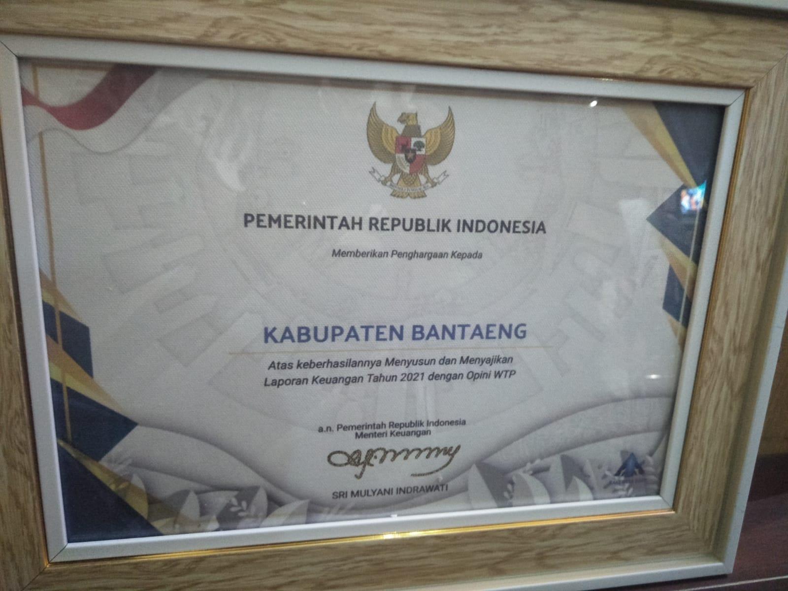WTP 5 Kali Berturut-turut, Bantaeng Raih Penghargaan dari Menteri Keuangan