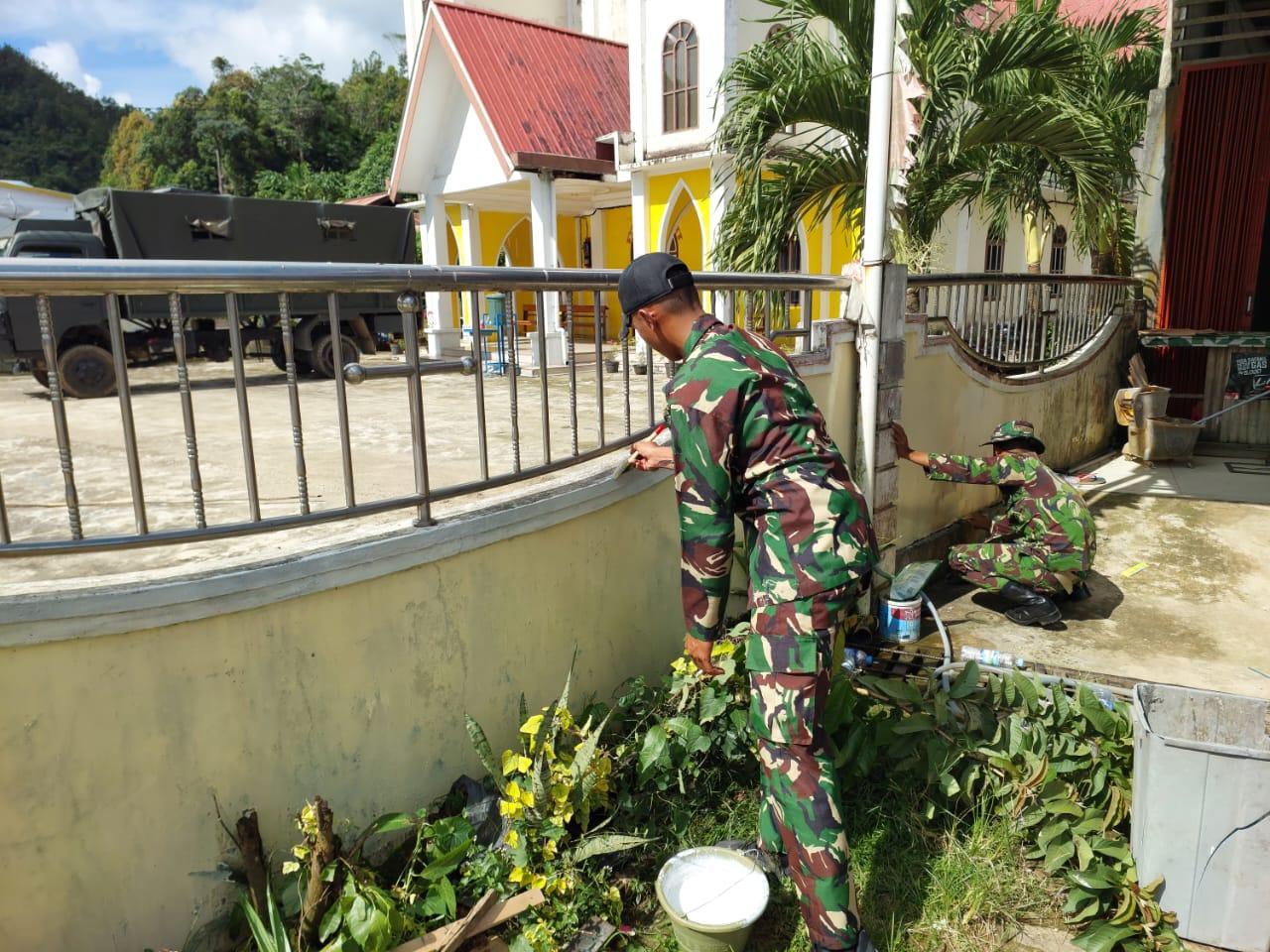 Wujud Kepedulian, Satgas Pamtas Yonif 645/GTY Karya Bakti Pengecetan Pagar Gereja HKBP di Perbatasan