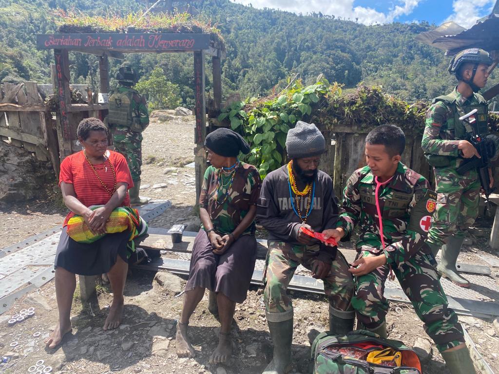 NDUGA – Peduli Kesehatan Masyarakat Satgas satuan organik Yonif Raider 321/GT dengan sigap memberikan pengobatan dan pelayanan kesehatan kepada masyarakat Distrik Dal Kabupaten Nduga, Provinsi Papua, Sabtu (09/07/2022)